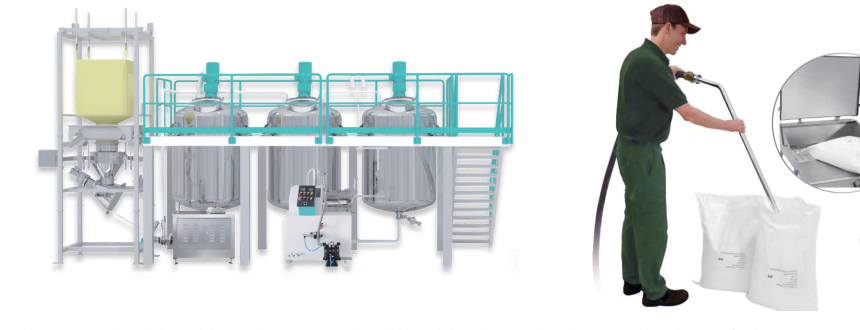 Dust free, loss free, powder feeding, wetting and dispersing to a completely des-agglomeration in one machine. No external vacuum generation or additional external air is necessary. By combining all processing steps into one machine, enormous rationalization potential is offered. Production time is minimized, partial processing steps are completely avoided, production cost is reduced to a minimum, energy saving. The basic idea of the IWD technology is that not only the powder is wetted, but also dispersed into a liquid under vacuum. Agglomerates are avoided, better reactivity, higher efficiency of the raw material and higher product quality are the results.